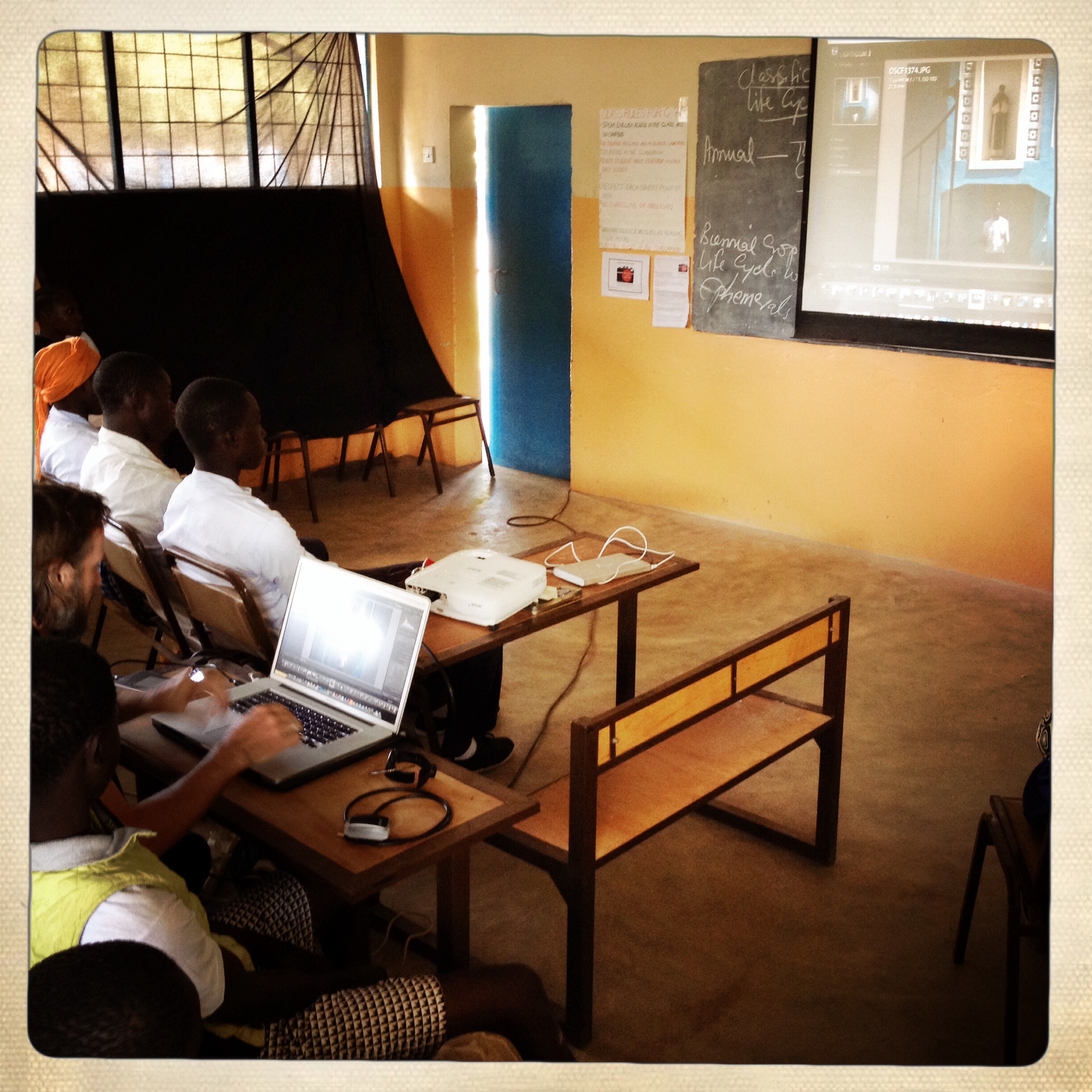 We have an audience! local village kids climb up to the window to watch the Florio’s slideshow with the students, Kartong © Helen Jones-Florio